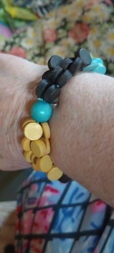 Mehrreihiges Armband mit kleinen, handbemalten Holzscheiben.