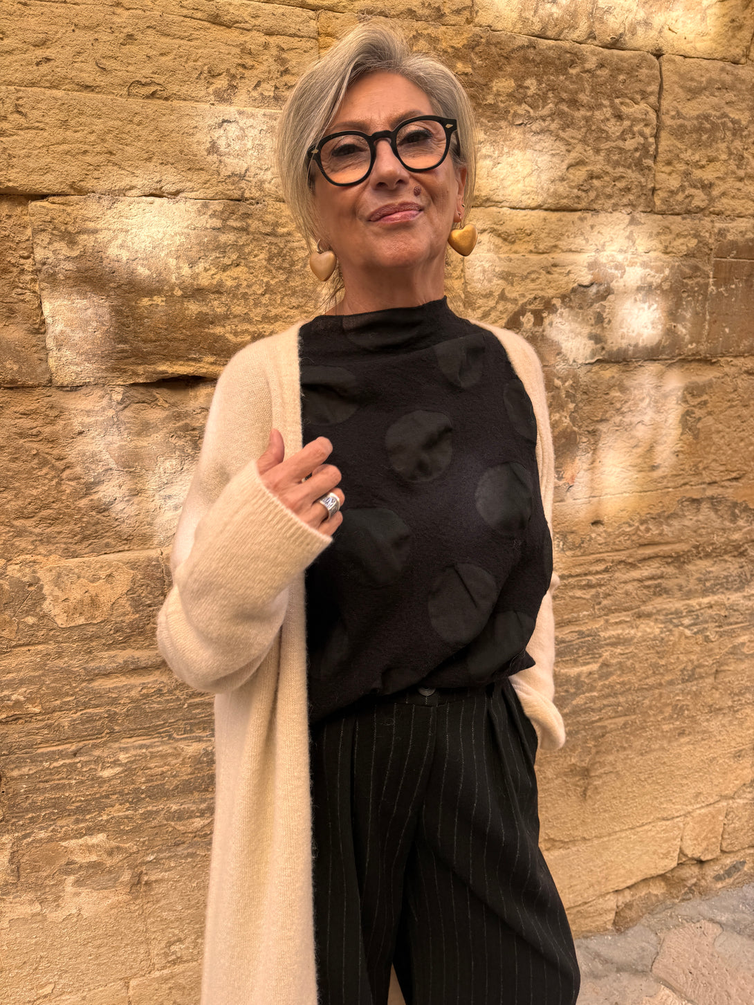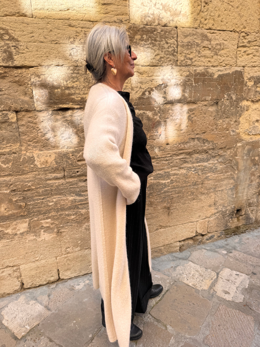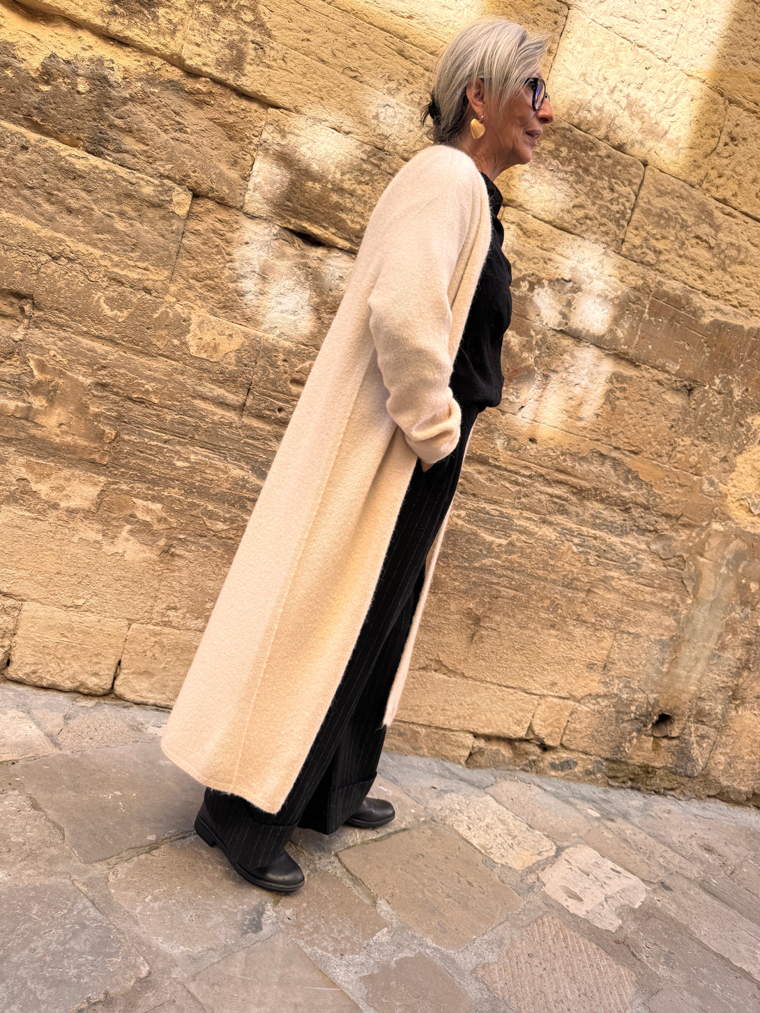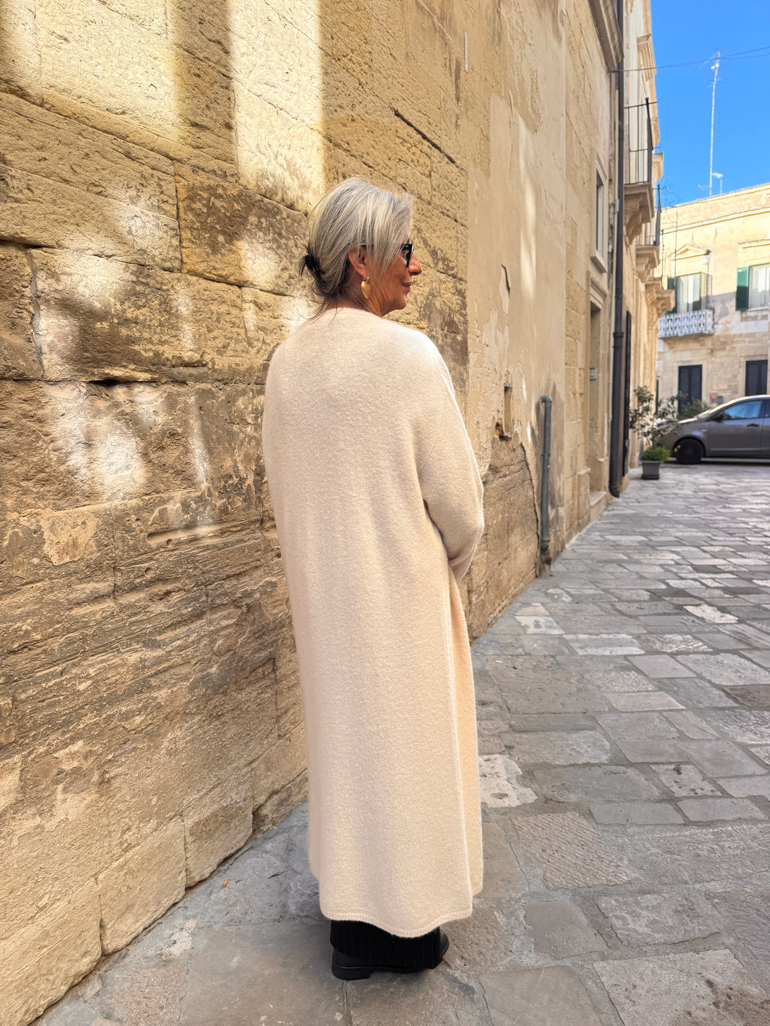 Questo cardigan lungo in lana alpaca rappresenta l'essenza del lusso consapevole. La fibra di alpaca, rinomata per la sua morbidezza superiore e leggerezza, offre un isolamento termico naturale senza peso, perfetto per le transizioni stagionali. Il taglio generoso e la lunghezza estesa lo rendono versatile: indossabile come pezzo statement su abiti leggeri o come strato raffinato su maglieria essenziale. La costruzione artigianale garantisce durabilità e una caduta elegante che migliora nel tempo. Un investimento in qualità che trascende le tendenze stagionali.
