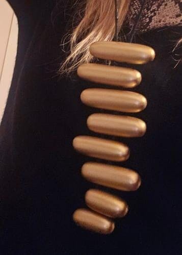 Holzkette aus verschieden großen Ovalen, die hintereinander angeordnet und nicht ausgerichtet sind. Perfekt für diejenigen, die nicht unbemerkt bleiben wollen und es lieben, bei jeder Gelegenheit zu verblüffen. Variable Länge.