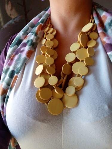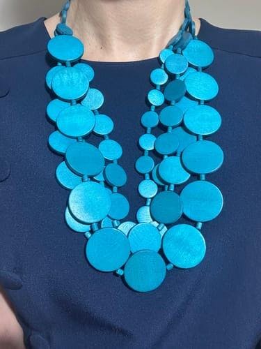 La Collana Italia legno ricca che si adatta anche ai décolleté più pronunciati, dato che non aggiunge volume. I dischi piatti legno di varie misure danno alla collana un buon dinamismo nella forma e accompagnano la scollatura con finezza e semplicità.