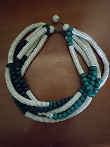 Collana dallo stile etnico composta da più fili di sfere e dischetti in legno.