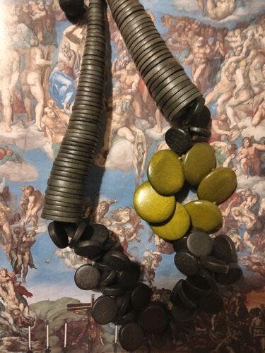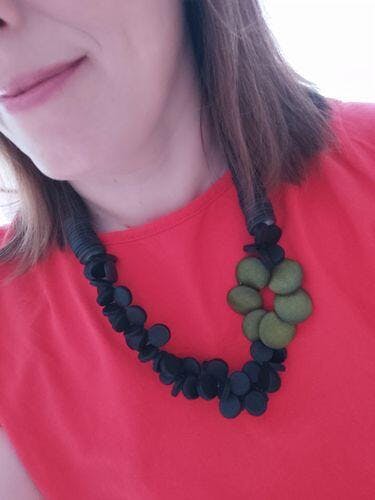 La collana Olanda con foglie e petali in leggerissimo legno lavorato a mano, è un elemento della collezione davvero glamour. L'intreccio delle foglioline è particolare e inusuale e diventa un tutt'uno con il fiore dai petali colorati.