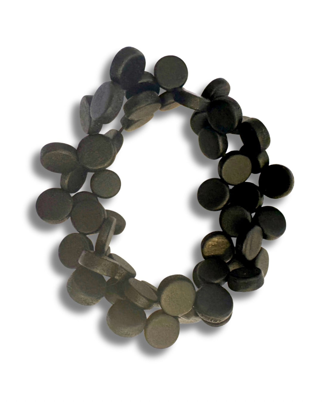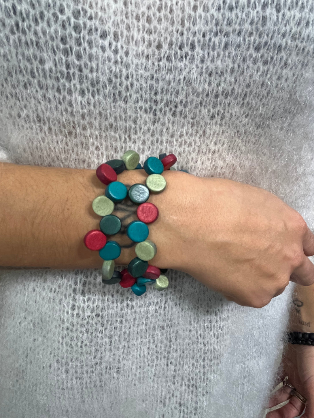 Bracciale multifilo, con piccoli dischetti in legno dipinto a mano.