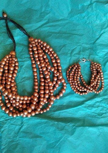 Tantissimi fili di perline in legno per questo divertente bracciale in legno. Se ami osare non perderti la collana in coordinato.
