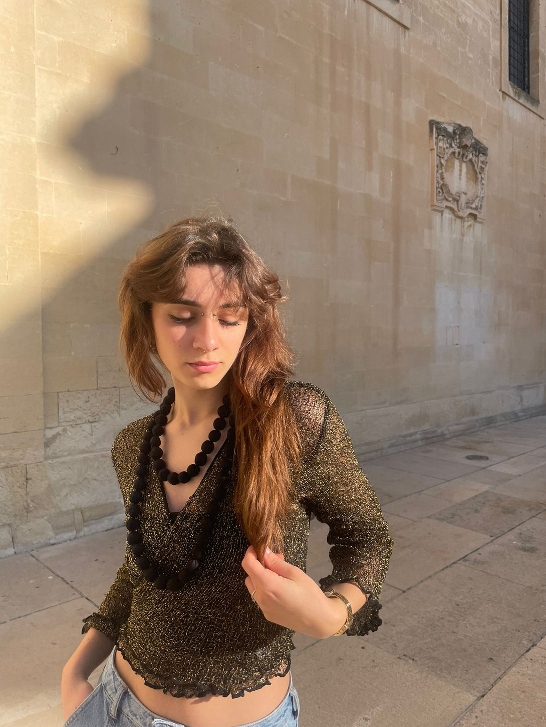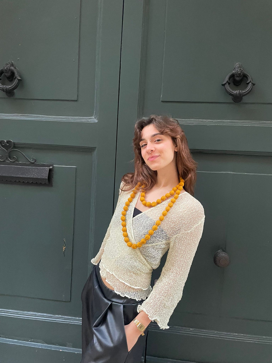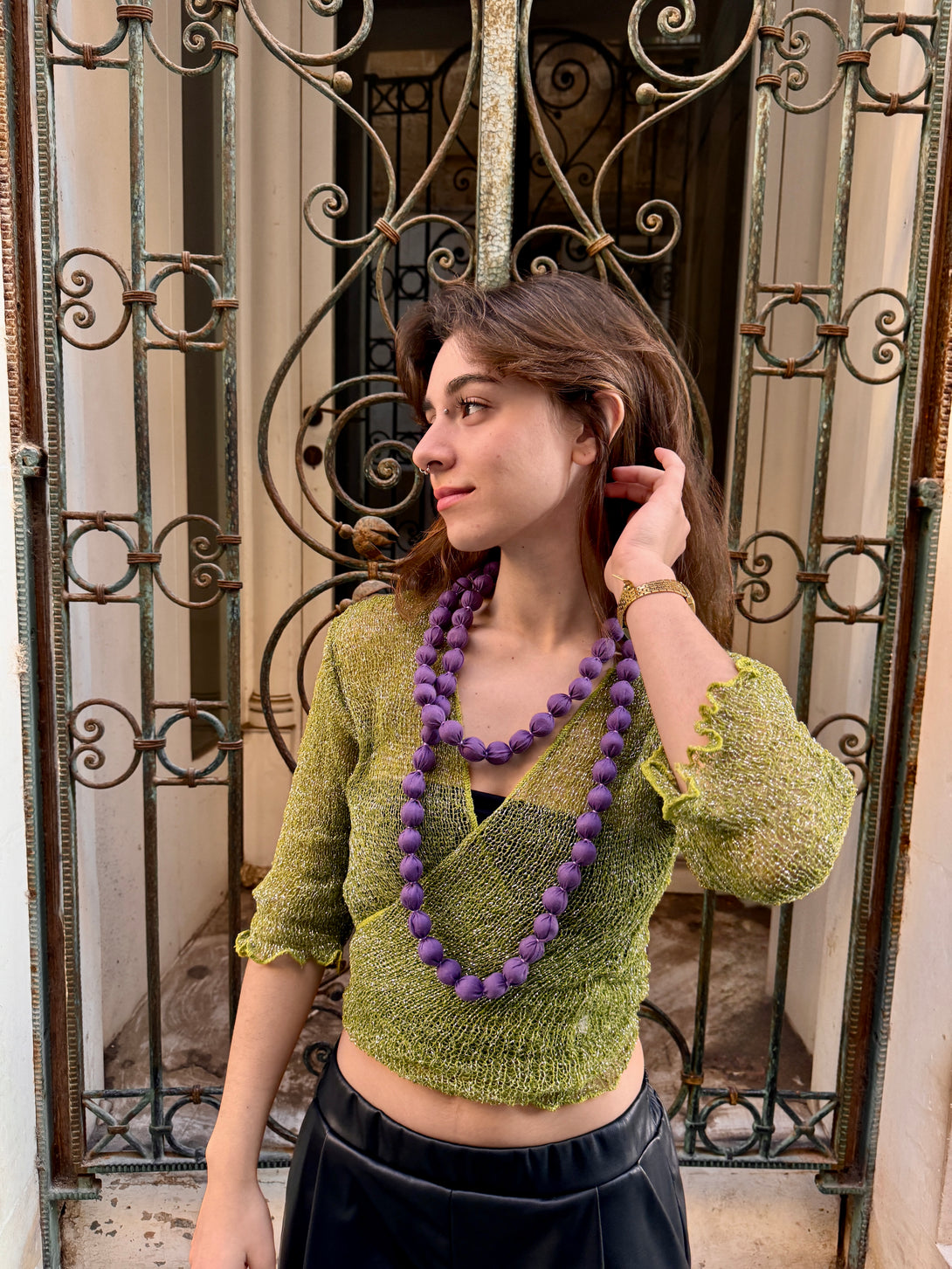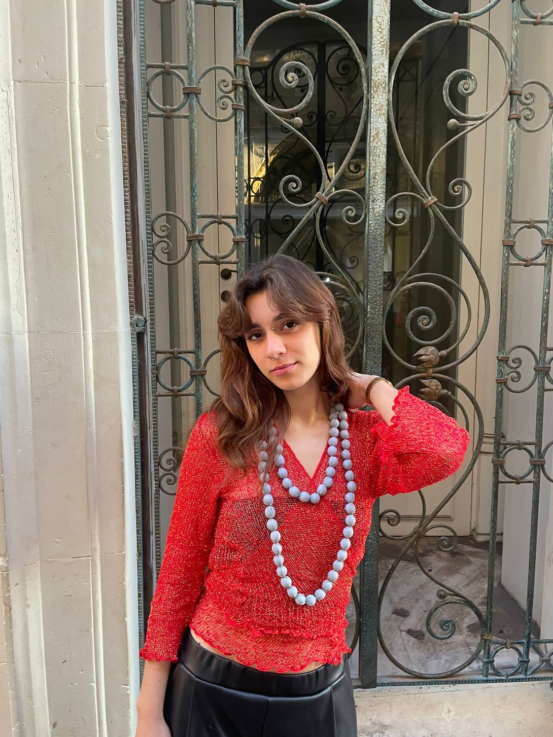 Cardigan traforato in rayon metallizzato che trasforma il tuo look con versatilità senza pari. La trama delicata con filo dorato crea un effetto sofisticato, perfetto da indossare aperto come coprispalle o chiuso in stile classico. Ideale per le festività natalizie e i party di fine anno, questo pezzo boho-chic aggiunge eleganza a qualsiasi outfit con un tocco di lusso artigianale.