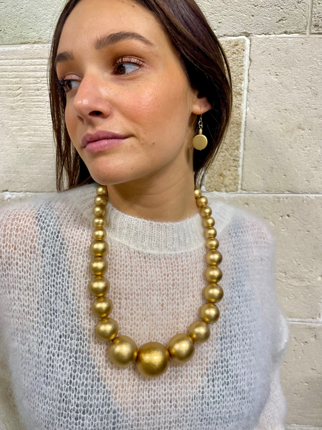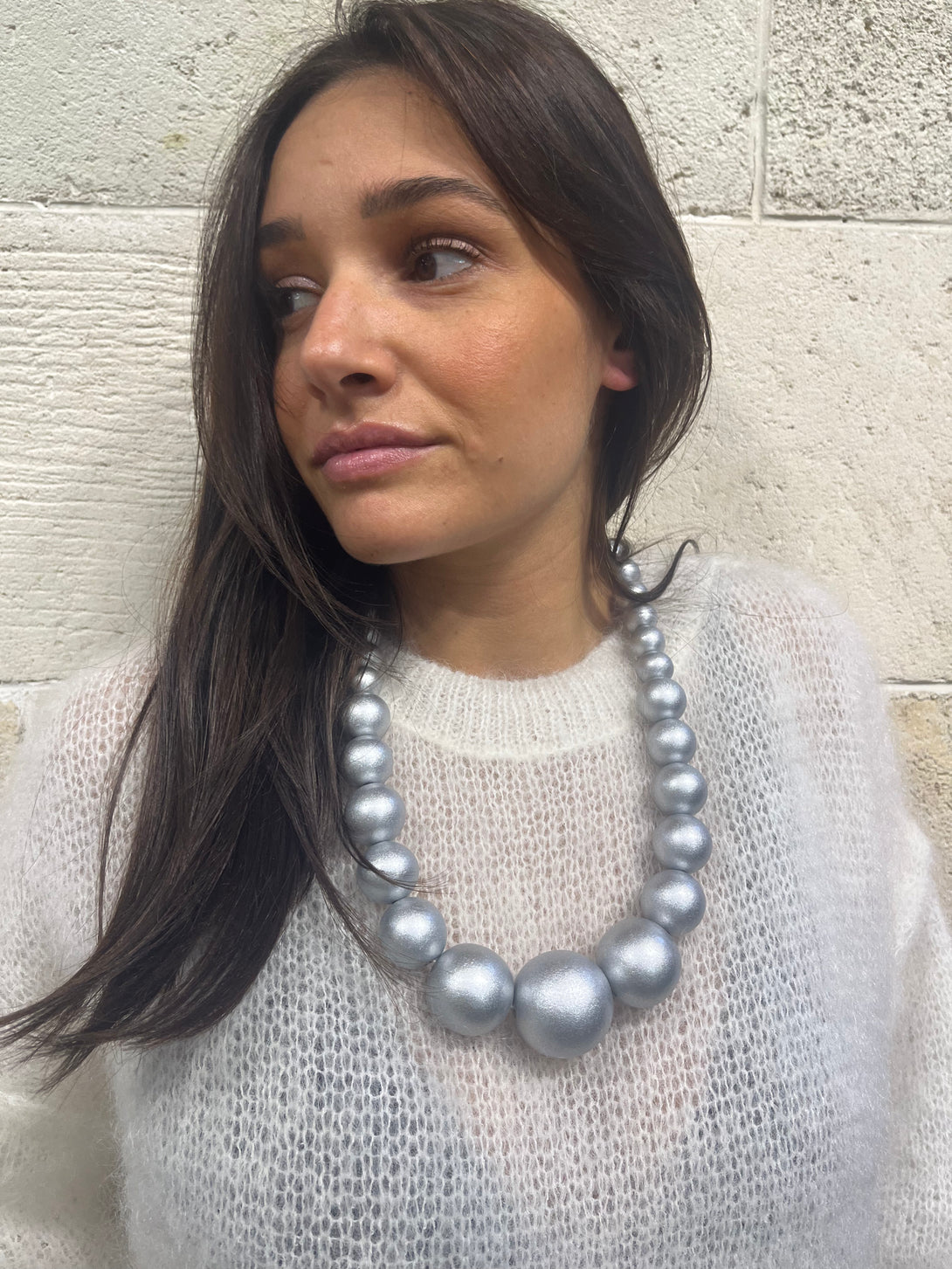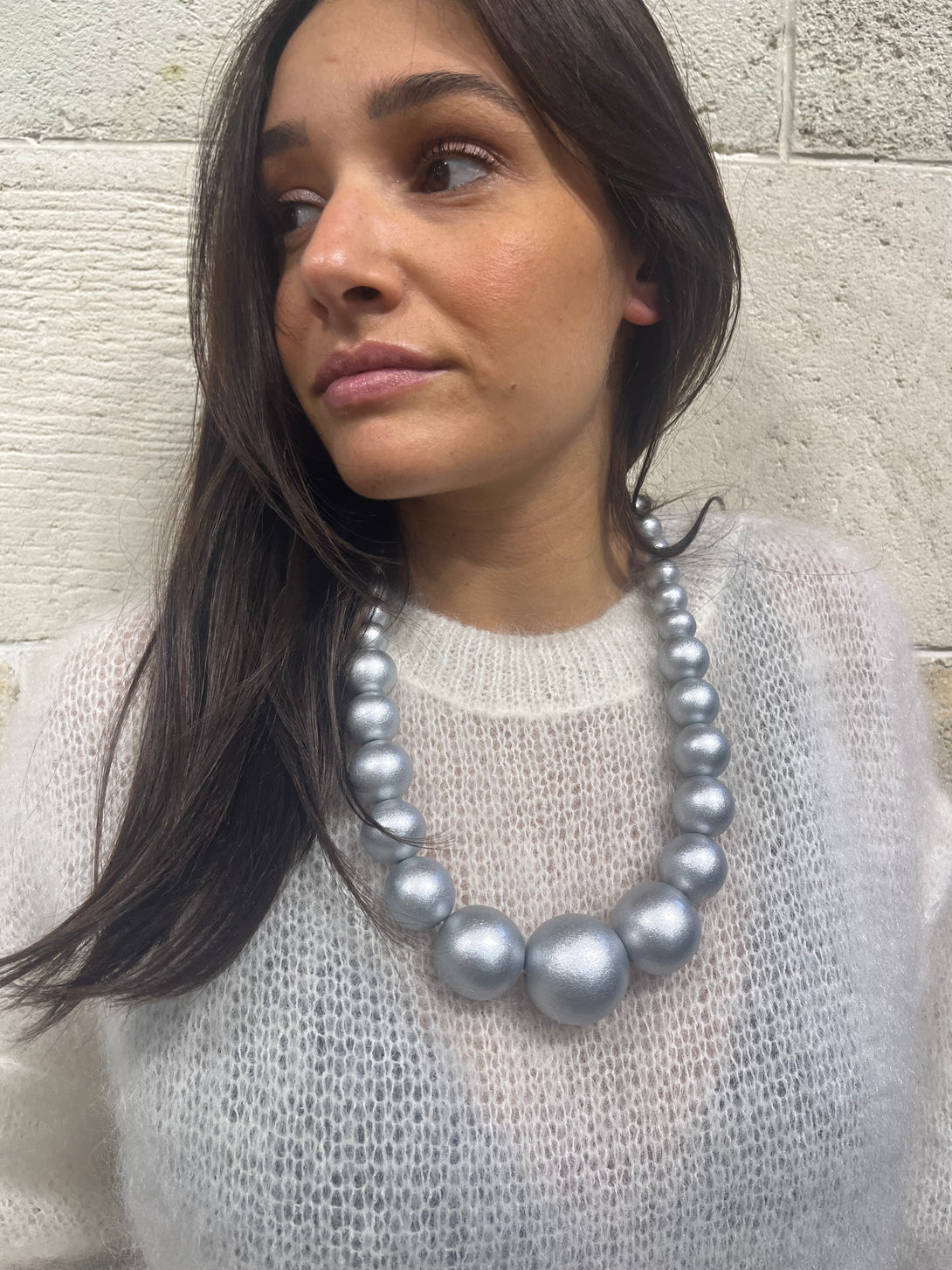 Collana in legno formata da sfere di diverse dimensioni. Perfetta chi ama osare e stupire, e per valorizzare un look essenziale ma ricercato.