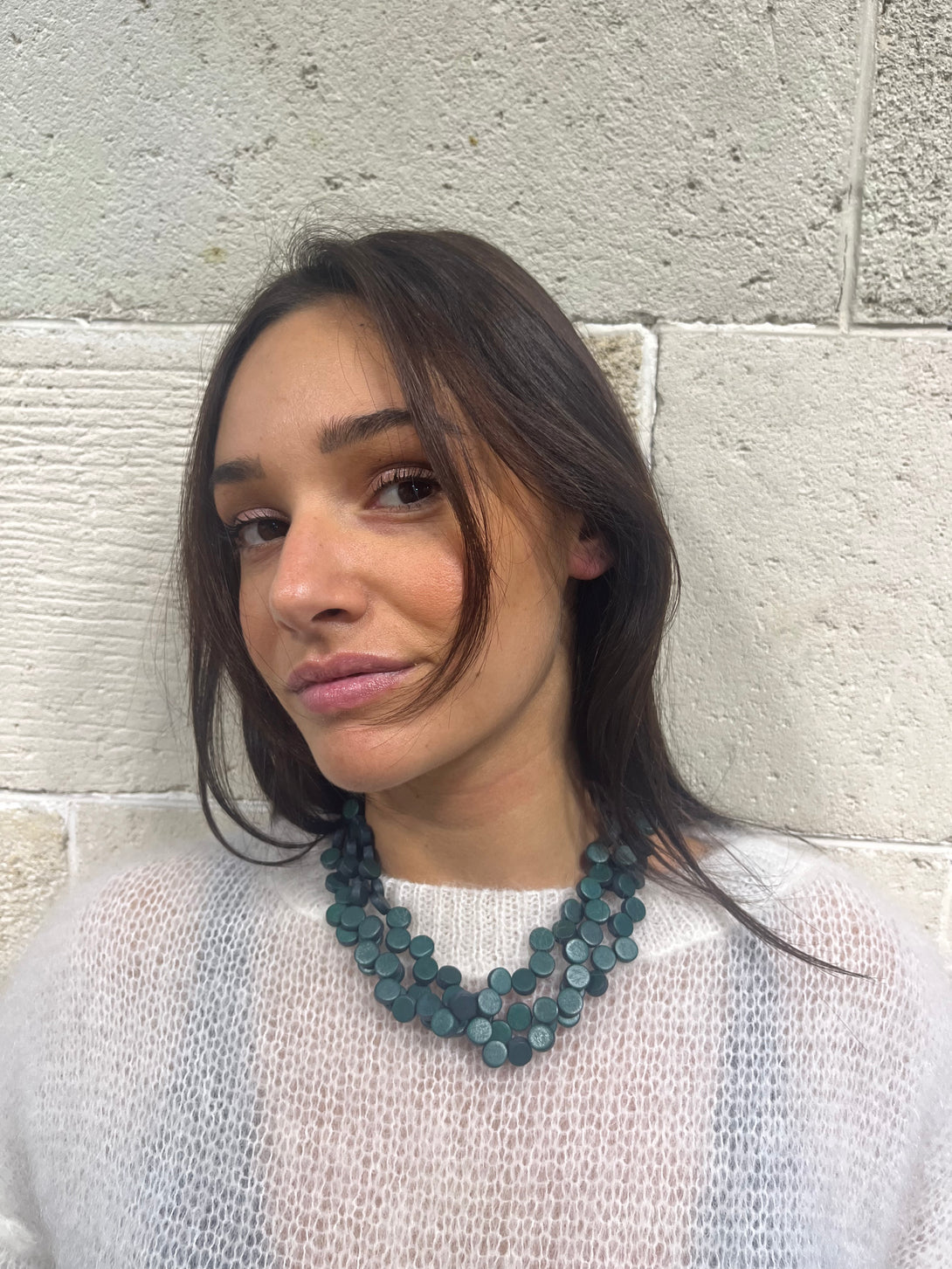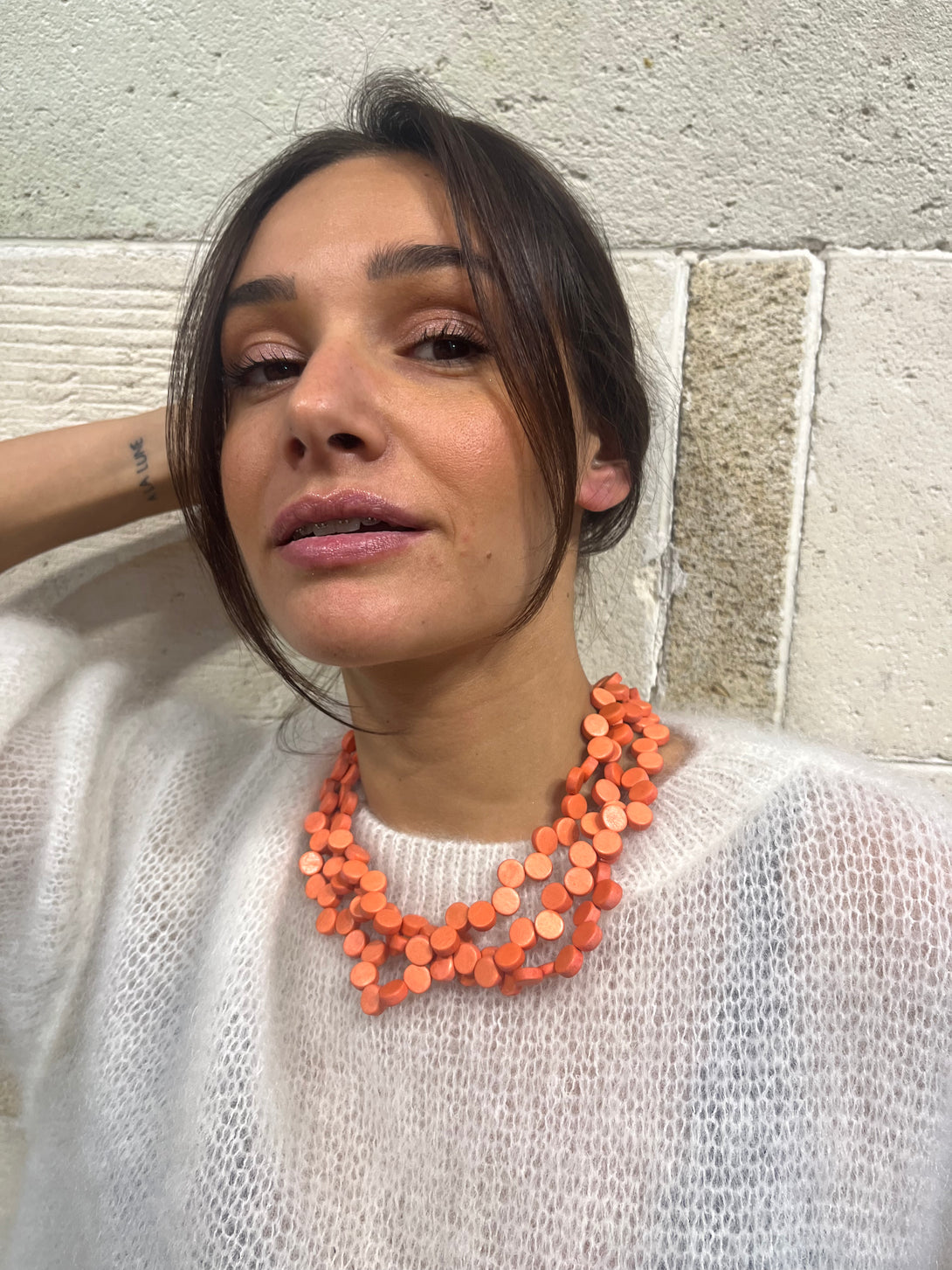 Collana corta, giovanile e colorata composta da tre fili di dischetti di legno. Un tocco di colore delicato semplice e particolare allo stesso tempo. Completa il tuo look con il bracciale abbinato!