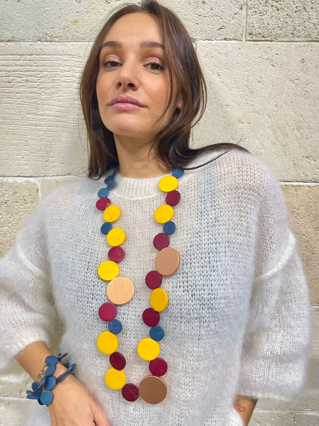 Collana in legno formata da tanti dischi di varie dimensioni disposti in maniera asimmetrica per creare movimento. Perfetta per chi ama gli accessori decisi e di impatto. Lunghezza non variabile.