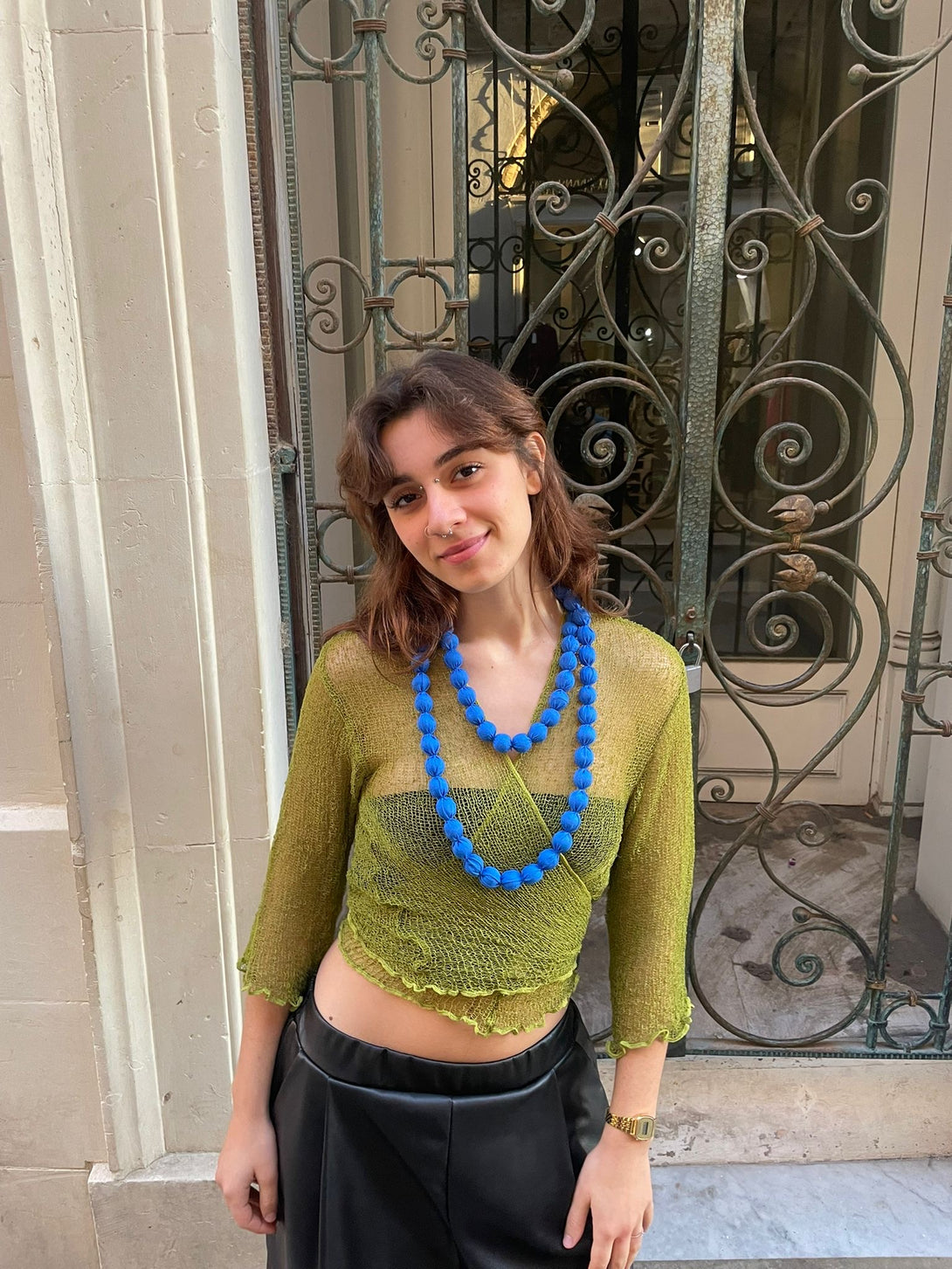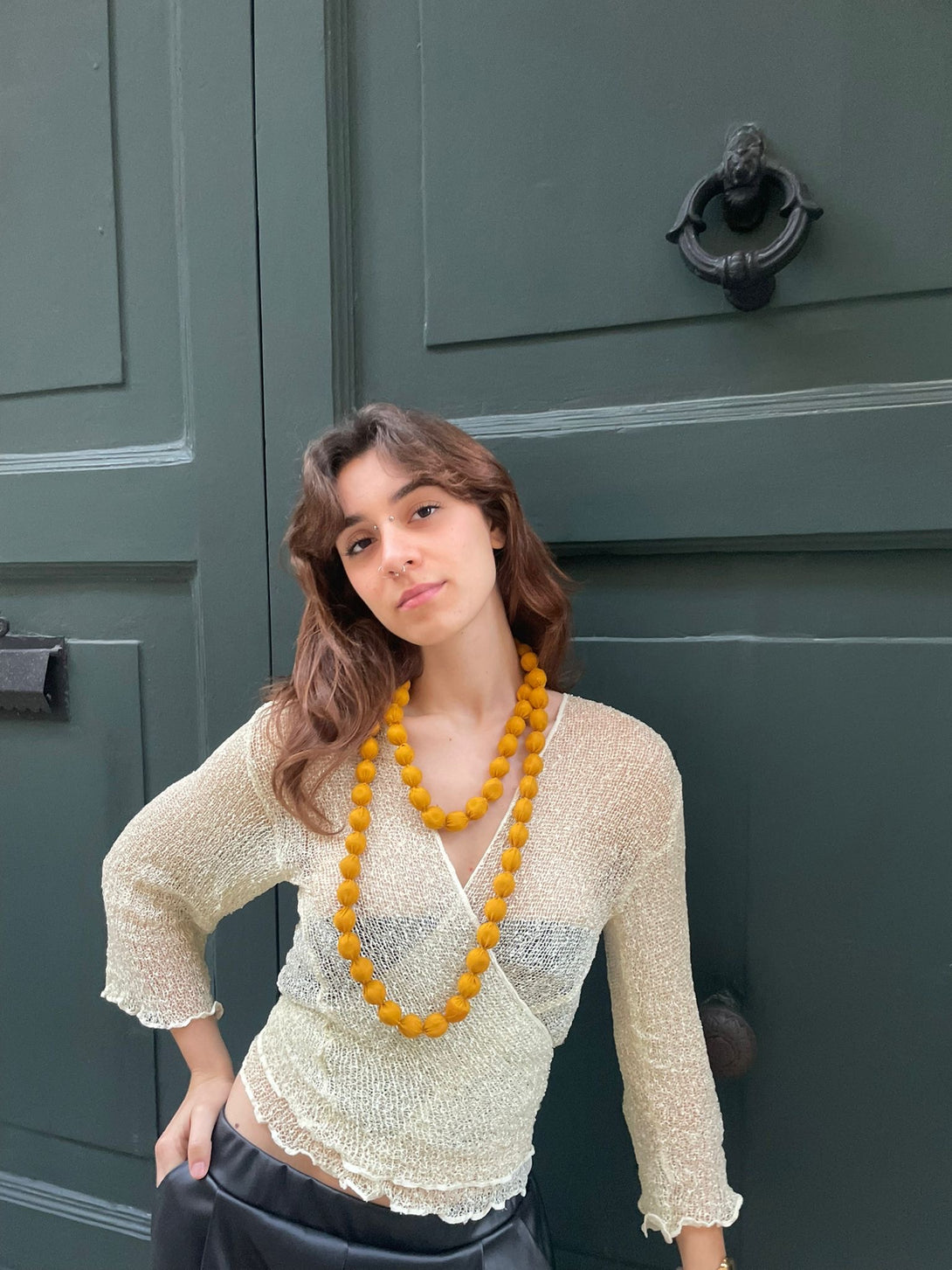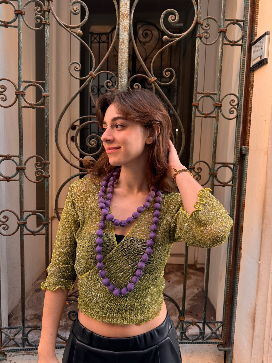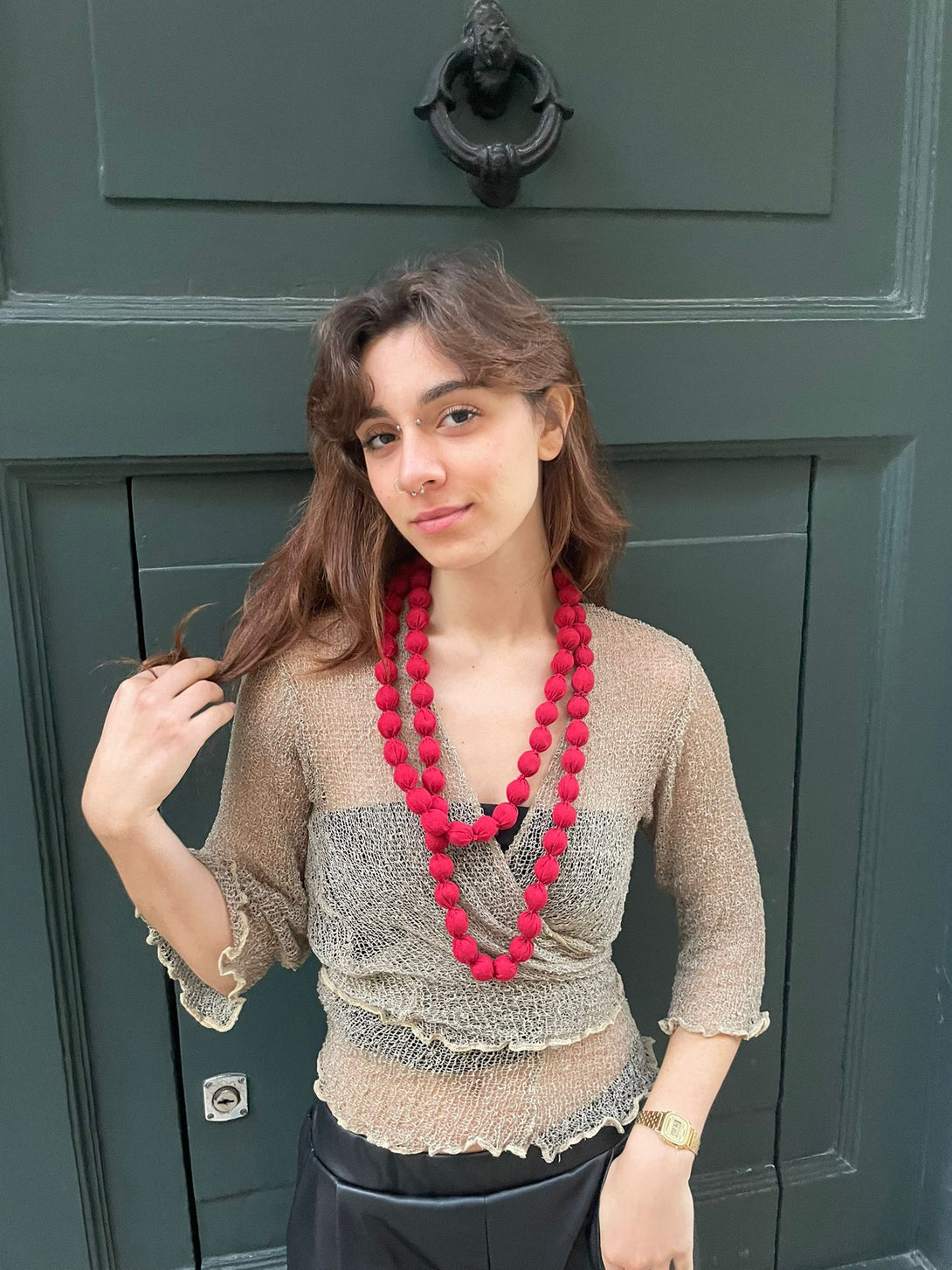 Questa collana è perfetta per chi ama uno stile giocoso e originale. Realizzata con legno e tessuto, aggiungerà un tocco di colore ai tuoi outfit. Ideale per essere indossata tutti i giorni o per dare allegria alle tue giornate