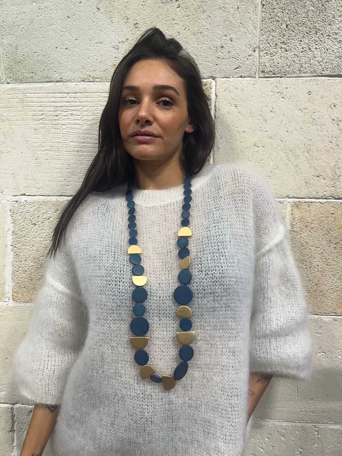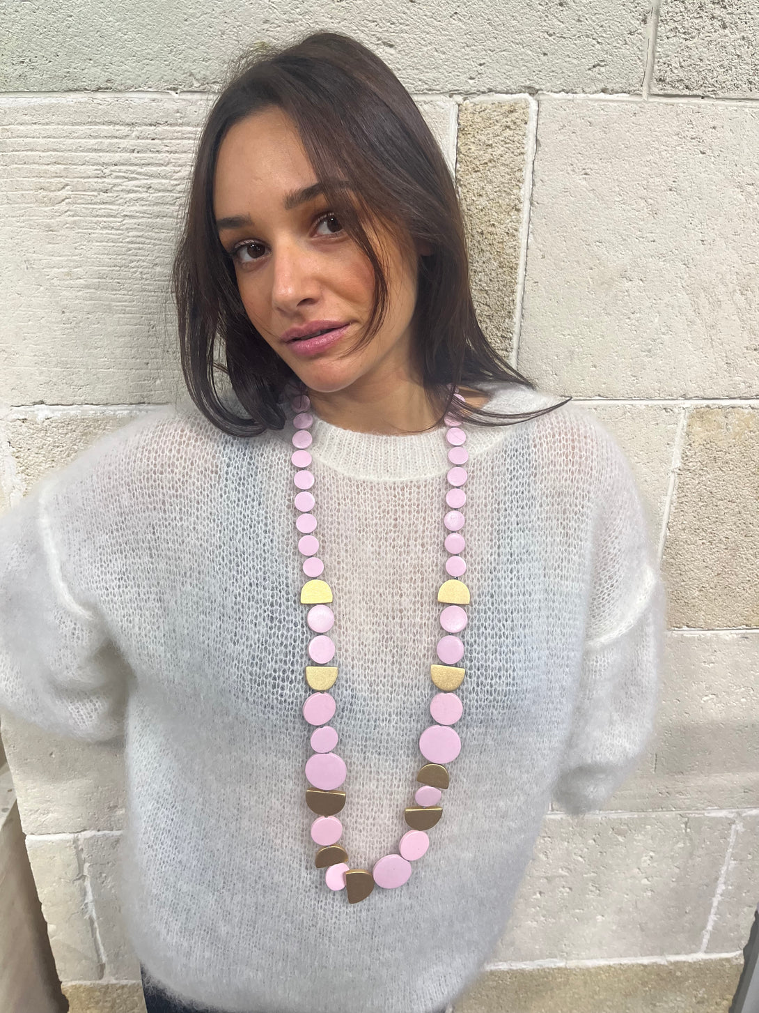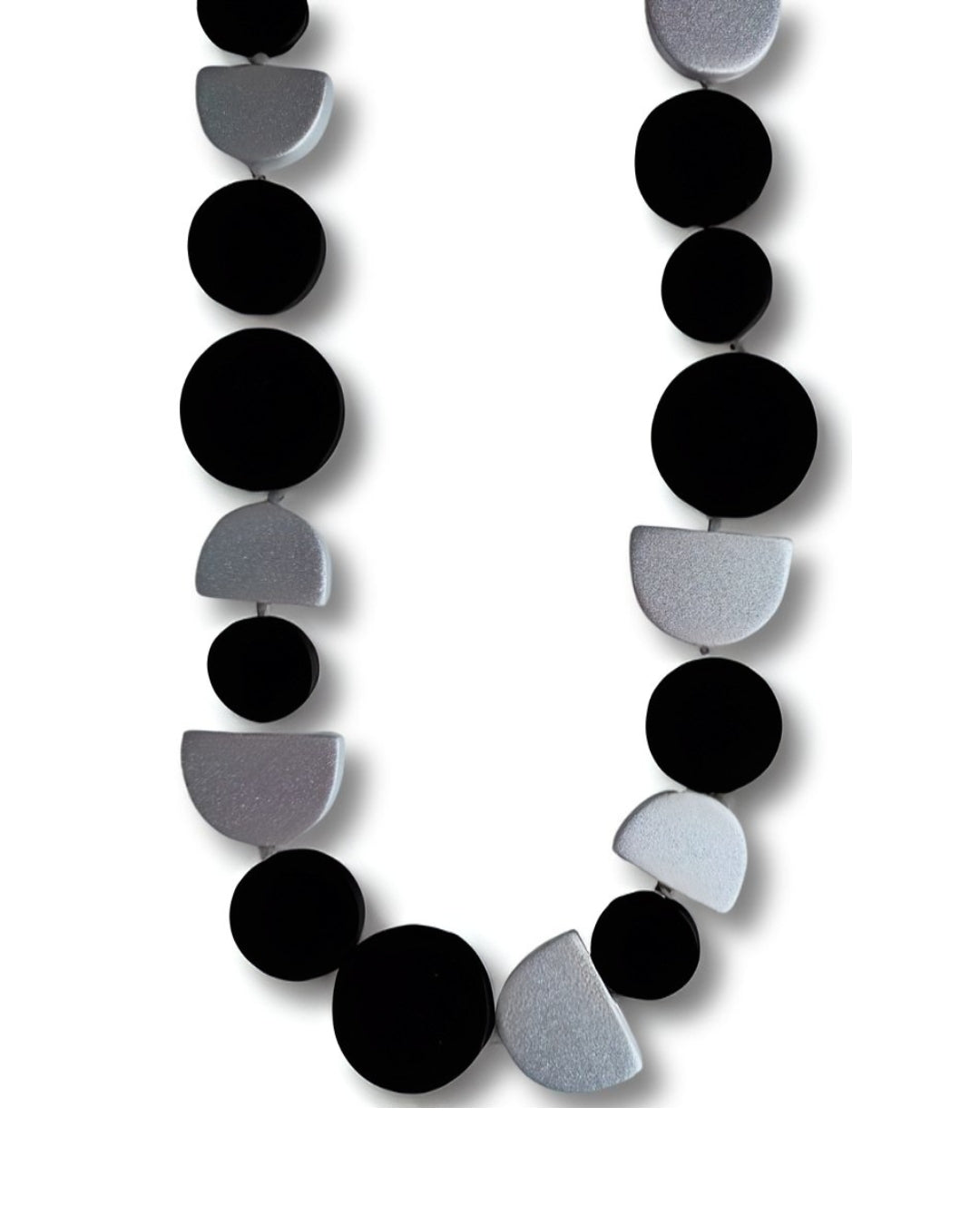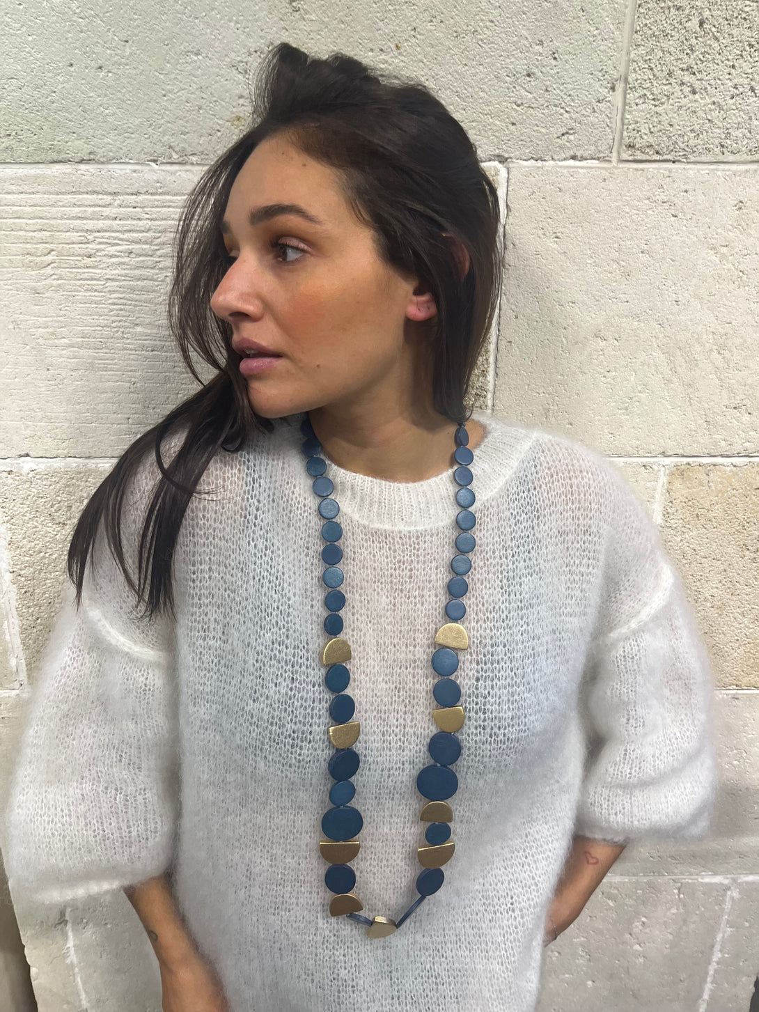 La Collana legno lunga Kira presenta una combinazione di forme e colori diversi, lavorati in modo da creare una texture unica ed accattivante e un effetto dinamico e unico.