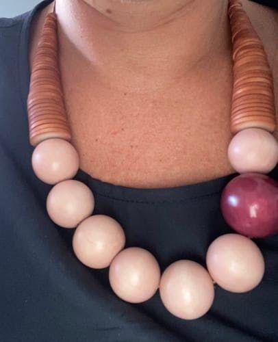 Collana con voluminose perle in legno, elegante e vistosa. Impreziosisce la scollatura di una camicia o di un abito con estrema semplicità. La sfera più lucida a lato è realizzata in resina e madreperla.