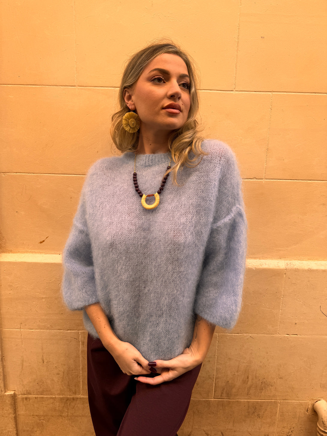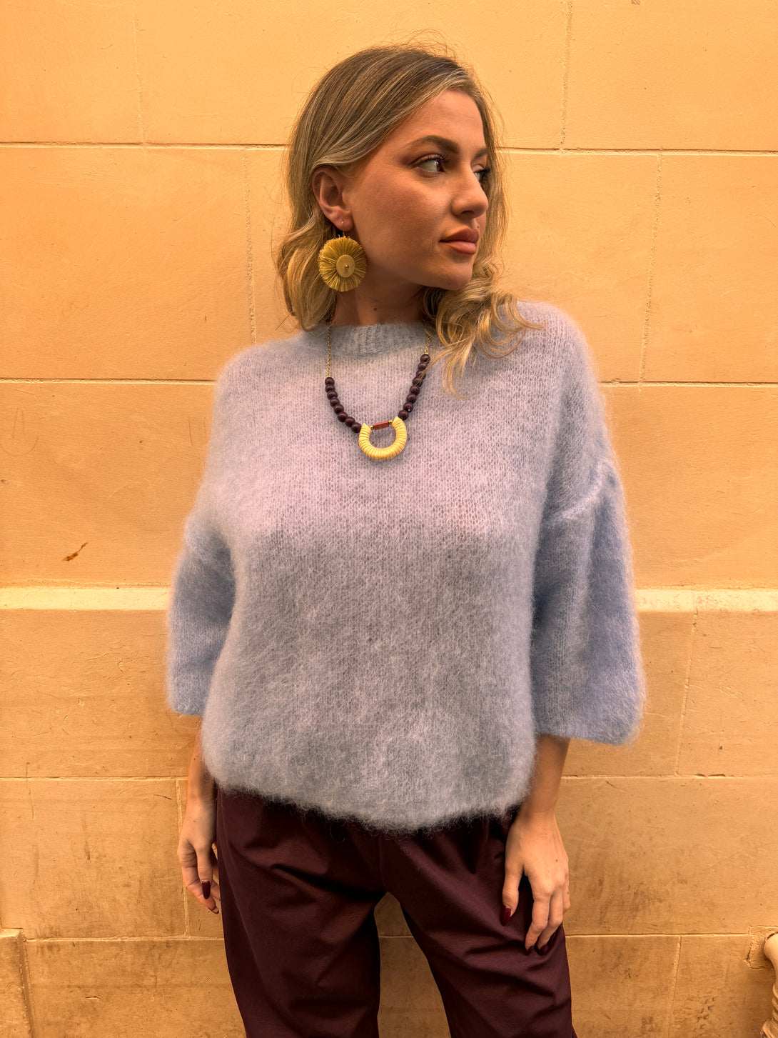 Sorprendi con il nostro Maglione kid mohair Azzurra! Il colore azzurro aggiunge un tocco di freschezza al maglione, mentre il morbido tessuto in kid mohair ti avvolge in un caldo abbraccio. Perfetto per le giornate più fredde, questo maglione ti farà sentire elegante e accogliente allo stesso tempo.