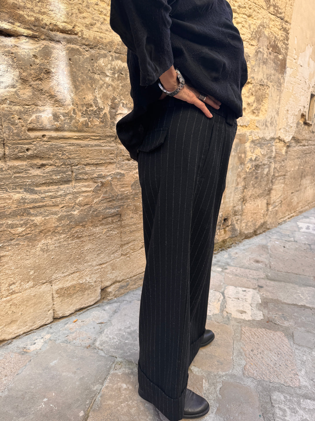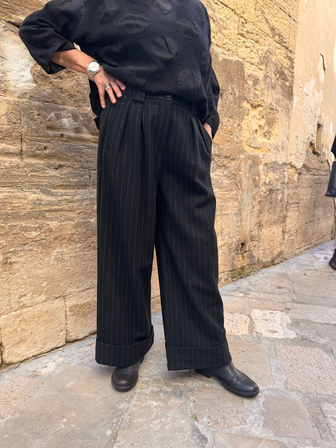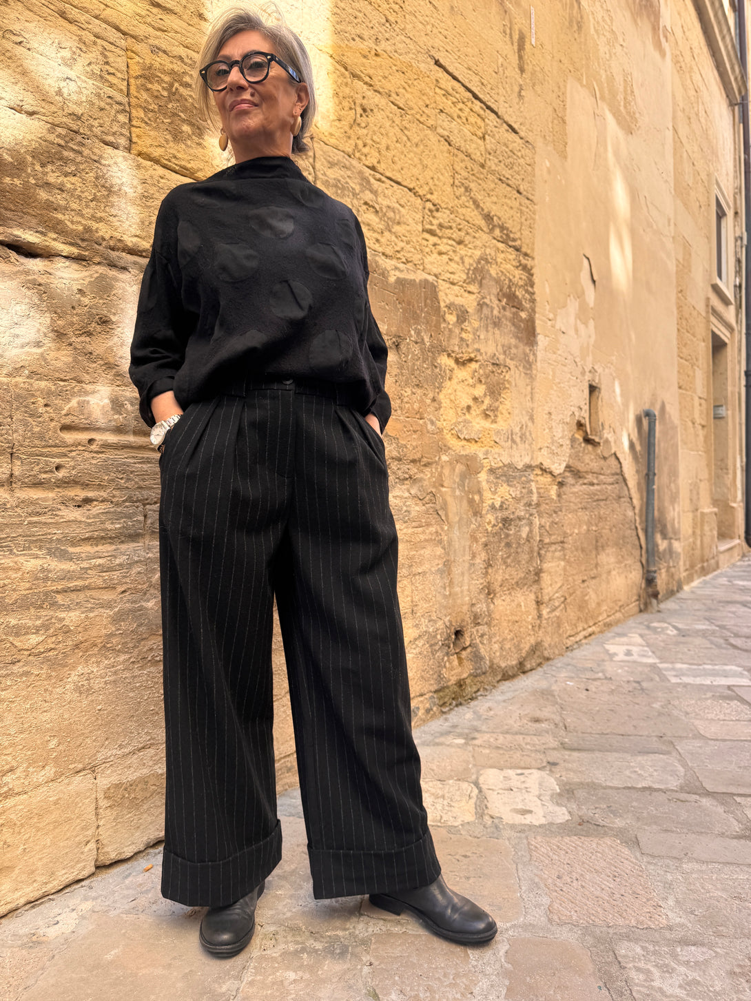 Pantalone gessato Cilian: il vostro nuovo alleato di stile. Vita alta che affina la silhouette, tessuto gessato che cattura lo sguardo con eleganza senza sforzo. Perfetto per chi ama il dettaglio raffinato e vuole sentirsi sicura di sé, dal mattino all'aperitivo. Un pezzo versatile che trasforma qualsiasi outfit in una dichiarazione di gusto consapevole.