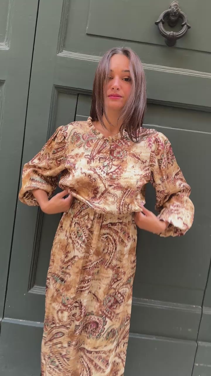 Il vestito lungo Clara unisce il fascino boho chic a una silhouette femminile e sofisticata. Realizzato in morbido raso, con maniche lunghe e un elastico in vita che esalta la figura in modo naturale, questo capo è perfetto per chi cerca eleganza e comfort in ogni occasione. Il design fluido valorizza ogni movimento, offrendo uno stile unico e raffinato.