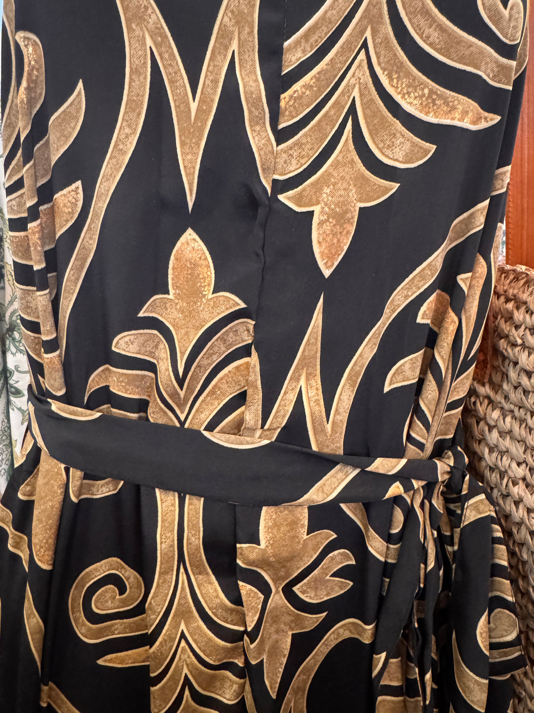 Scopri il fascino giocoso di questo vestito lungo in seta con dettagli in oro laminato Maly. Leggero e fresco, si indossa aperto per un look sbarazzino o con la cintura per un’eleganza raffinata. La stampa grande e particolare aggiunge un tocco unico, perfetto per chi ama distinguersi con stile e allegria.